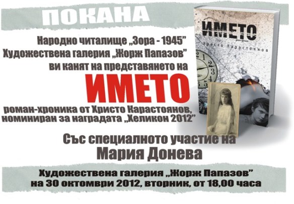Премиера на „Името“ – роман-хроника от Христо Карастоянов, в Ямбол Изображение Posted on 28/10/2012 by Мария Споделяне:СподелиХаресвам Зареждане... Свързани
