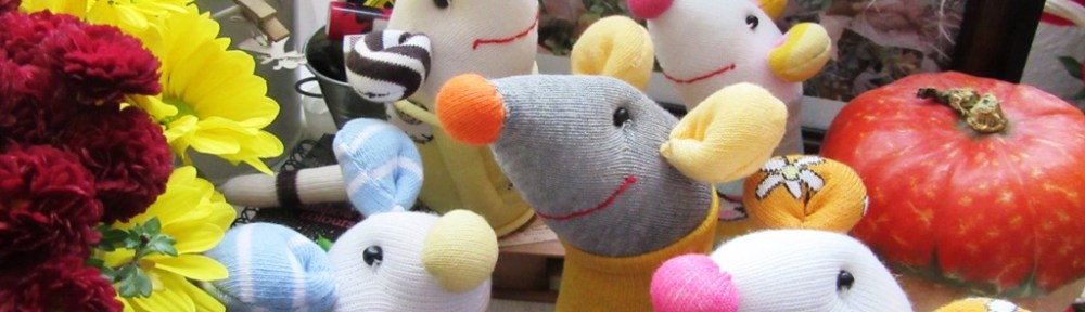 Мустак на мишка, цялата в жълто, сред хризантеми и оранжеви тиквички.