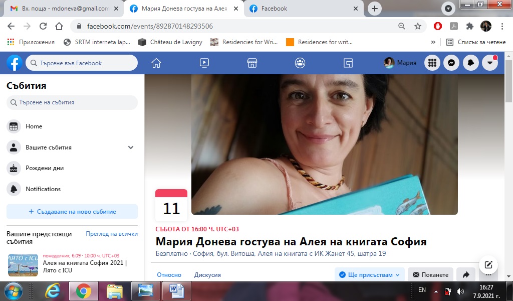 Знаете ли какво ще стане? Утре ще ни локнат даун и няма да се видим повече чак до пролетта, в добрия случай. Затова, докато още е топло и може да се срещаме на открито, дайте да не пропускаме моментите. И аз писах на Зоре: Зоре, ти си на море, обаче нямам търпение да се върнеш, затова ти пиша служебни работи в дълбоката нощ: ще бъда в София на 11 септември, дай да дойда на Алеята, да си играем на „жената зад щанда“, да изядем по един бонбон, аз ще рецитирам неудържимо на минувачите, ти ще им продаваш книги с намаление, чудно ще си изкараме. И Зоре вика: ела. ОБЯВЛЕНИЕ: На 11 септември от 16 часа ще мога да бъда забелязана в шатра 19 и околностите й, ще харча пари за книги, ще виждам любими герои от фейсбук и ще ги обикалям на стесняващи се концентрични кръгове, докато накрая те се запознаят с мен, или докато избягам, или и двете; и също може да подпиша някоя книга, за предпочитане от моите, и ще размахвам „Рибко“, като най-новоизлязла, и всичко, всичко!