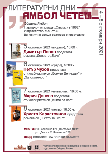 От три години и половина не съм ходила в Ямбол, в любимия Ямбол! От сега ми е щастливо, че на 7 октомври ще имам възможността да участвам в Ямбол чете. Срещата е от 18 часа в Синия салон на читалище „Съгласие 1862“, но аз мисля да отида половин-един час по-рано, ей така, от нетърпение.