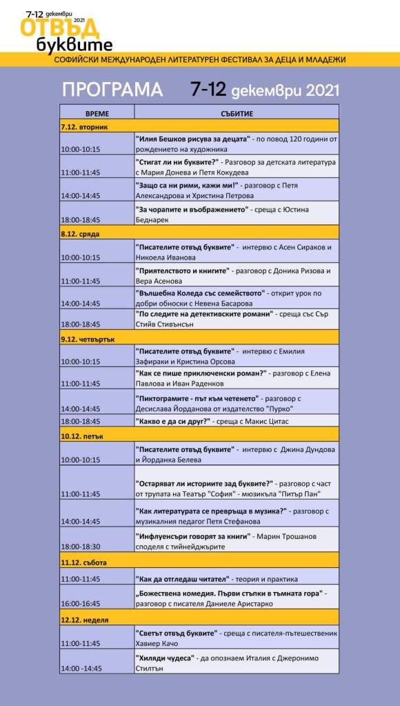 Другата седмица от вторник до неделя ще има фестивал на детската книга. Аз му казвам така накратко, а пък той си има име СМЛФДМ. На картинката по-долу ще го видите разгърнато. Ще има срещи с писатели, художници, музиканти, артисти, хора с най-различни дарби и занятия, свързани с книгите. Аз най-много се развълнувах, като видях, че на 12.12 ще има среща и с един мой приятел, Хавиер Качо, ура. Ние пък с Петя Кокудева ще участваме във вторник.