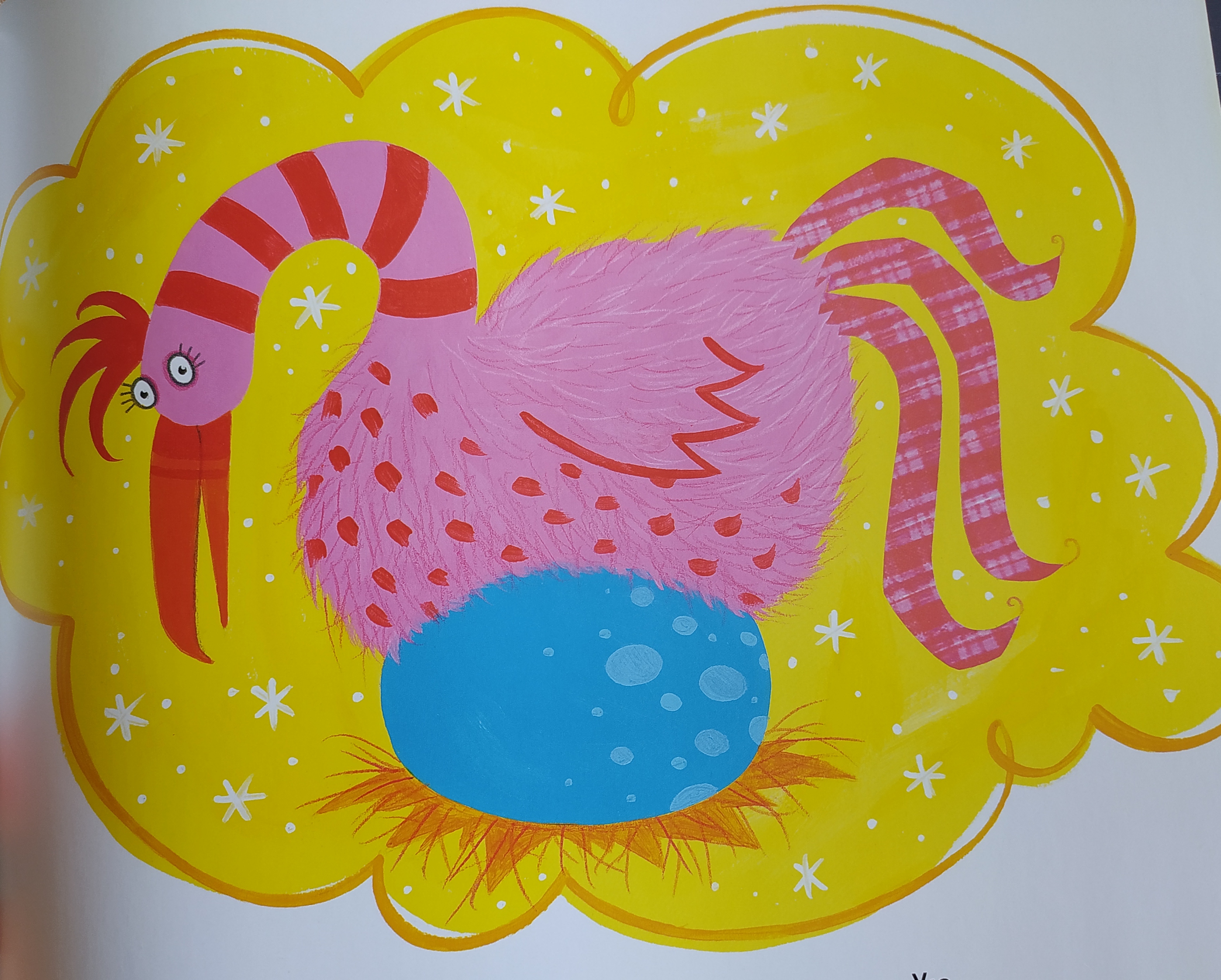 Обичам тази книга, защото в нея има една розовопера гушка, която снася гигантски яйца и мърка като котка и това ми е много смешно.