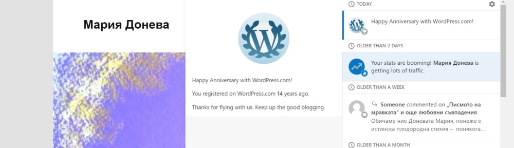 1. Мила Мария! Следя блога всичките тези 14 години, имам някои от издадените стихосбирки, била съм на концерт в Чайната, следя ФБ публикациите, чета и в Сега. Творческо вдъхновение, идеи, желание за работа – моите пожелания! Здраве, пълни с радост дни, Мария! Честит празничен ден на думичките по белите странички!