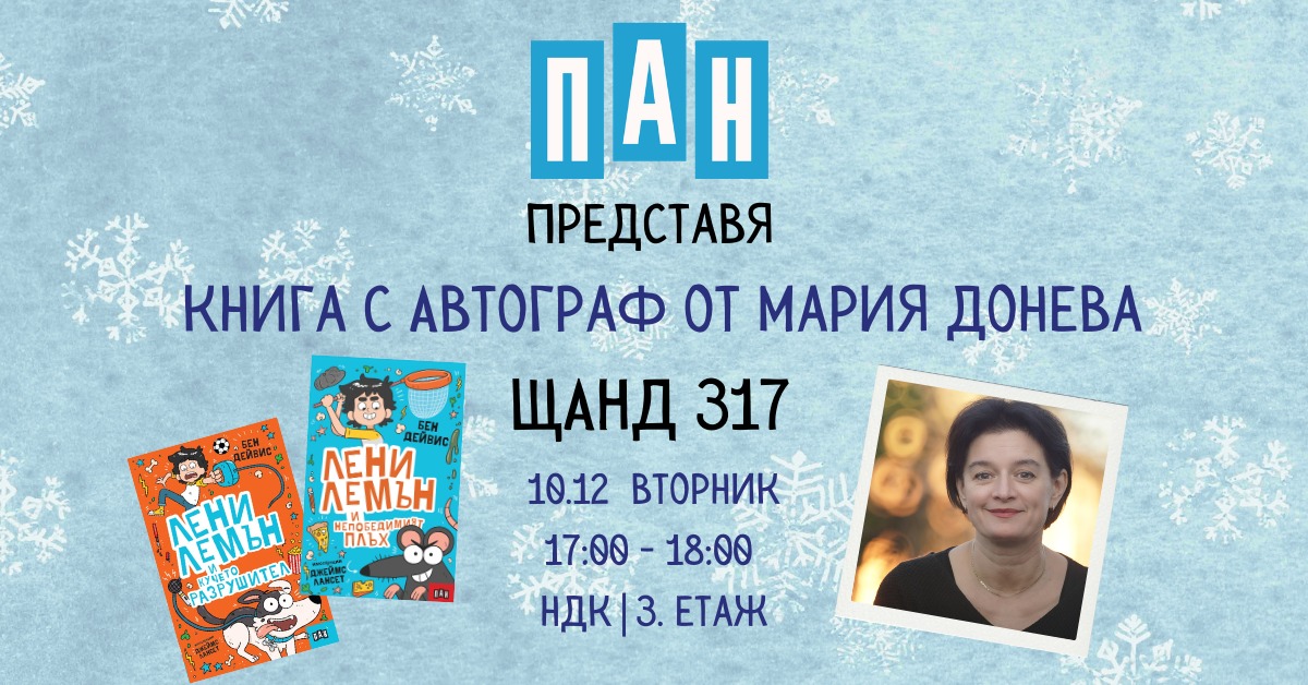 И двете са планирани за 10 декември, на щандовете на издателства ПАН и Жанет 45, които са един срещу друг. Първо, от 17 ч., при ПАН ще празнуваме какъв сладур е Лени Лемън, второ от 18 ч. ще празнуваме ВСИЧКО при Жанет 45.