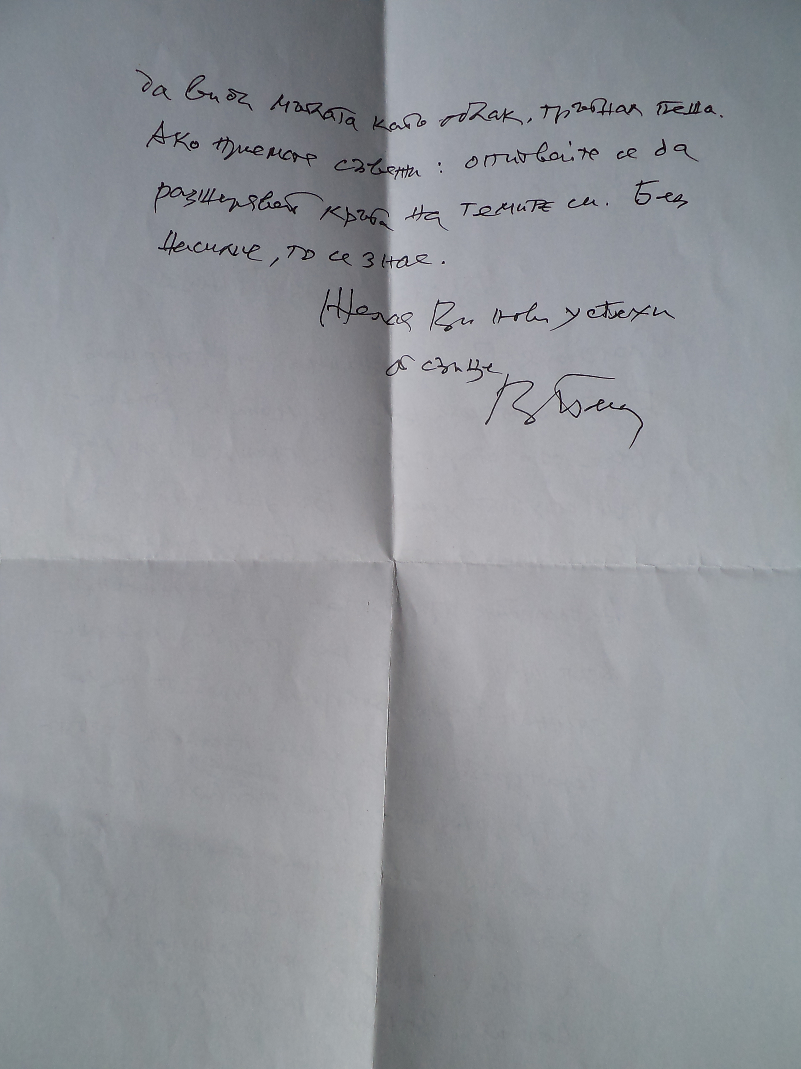 Сещам се и за друго нещо освен за китовете. За огледалото на Атанас Далчев. Той има едно стихотворение, цитирам по памет, в което се казва, че когато се огледал една сутрин, със страх установил, че от огледалото го гледал баща му. Става дума за времето, за преходността на човешкия живот, за неговата повторяемост и кръговрат.