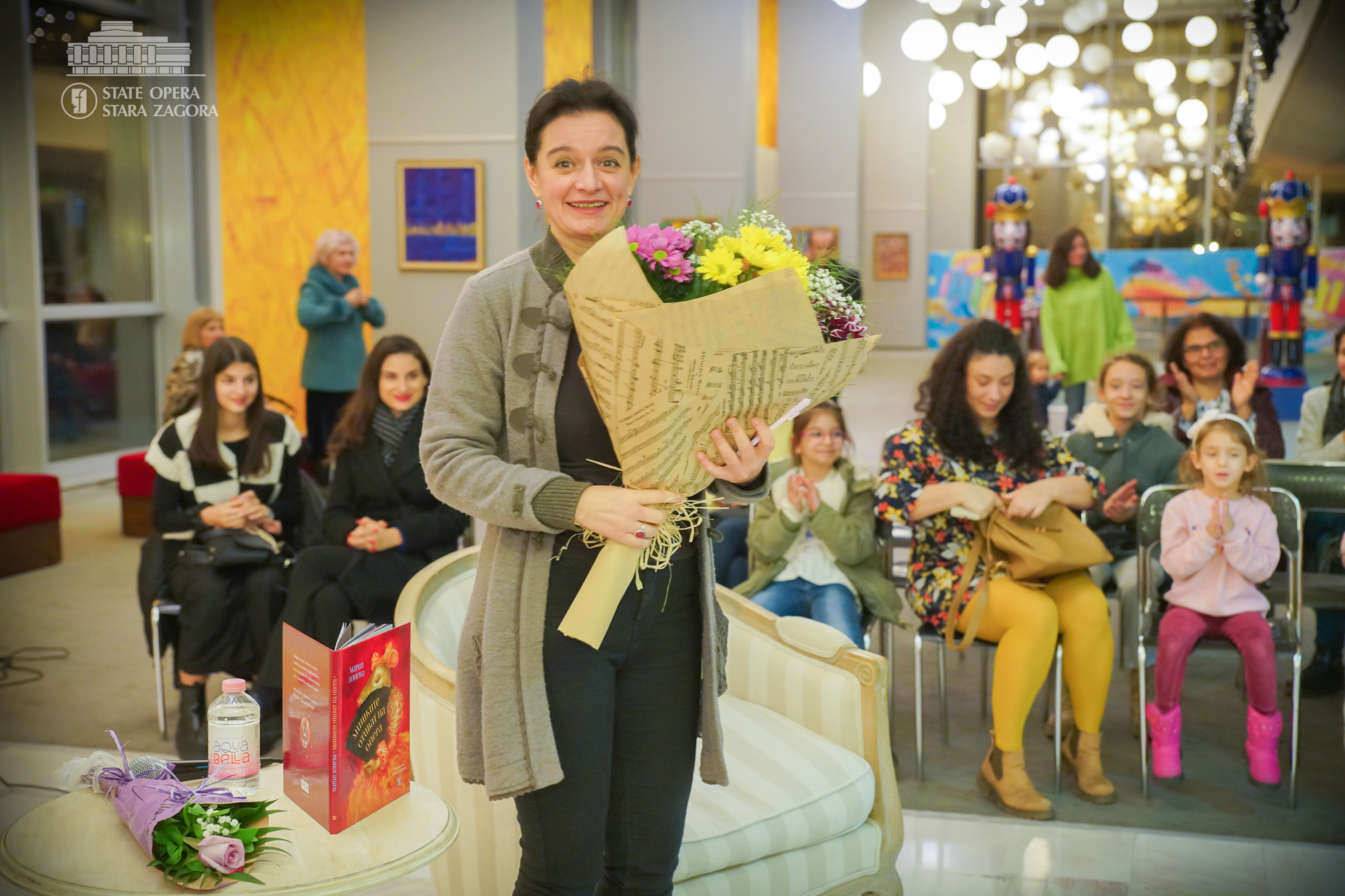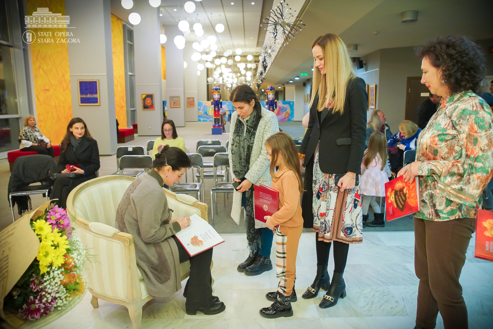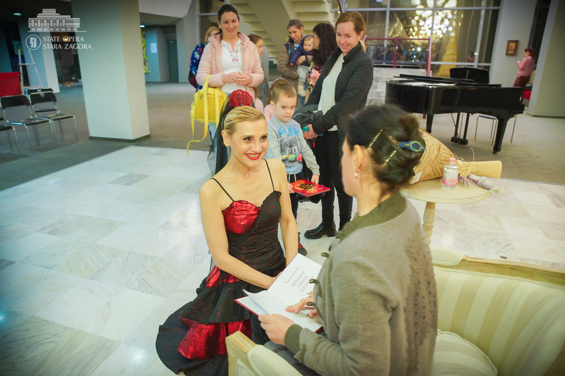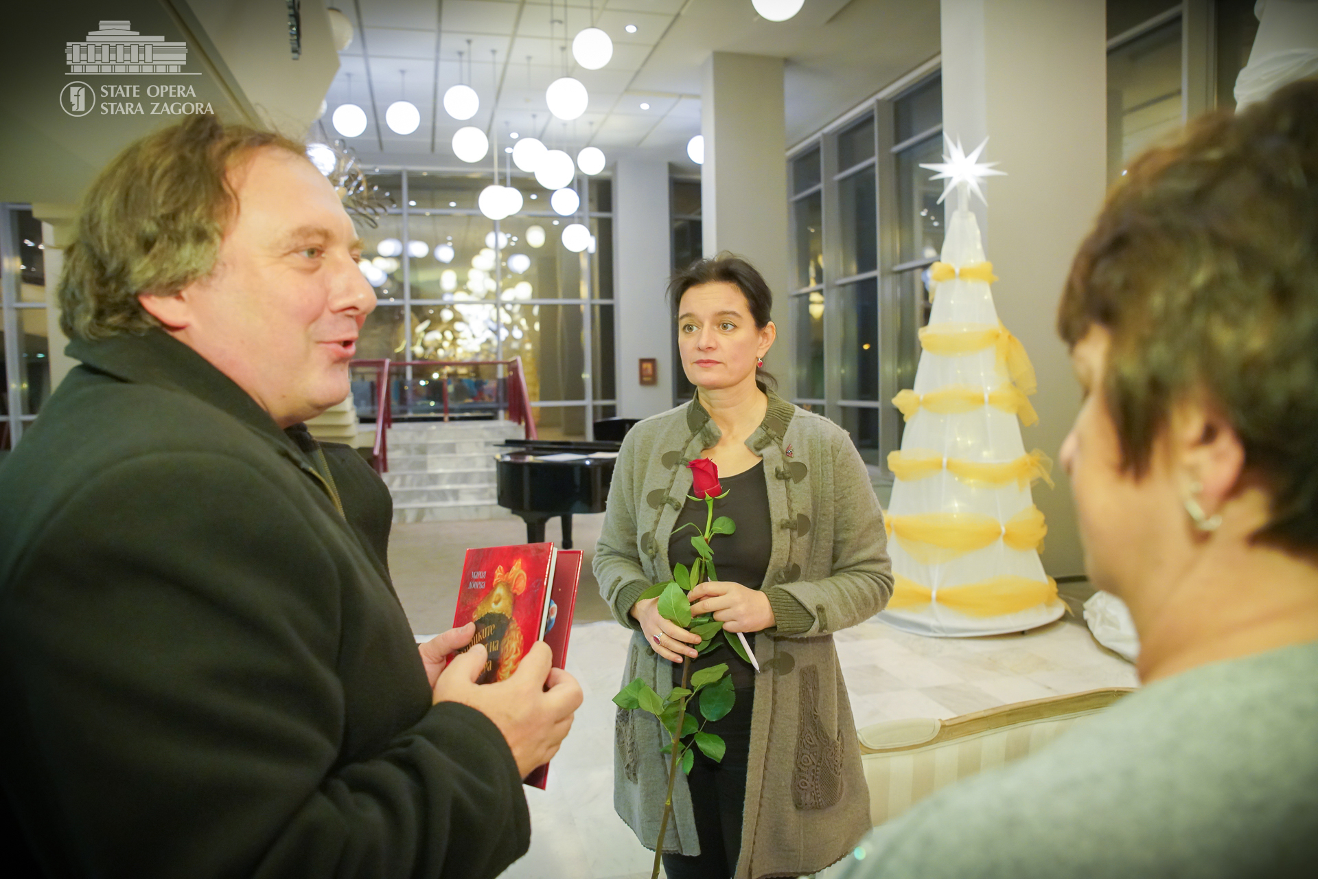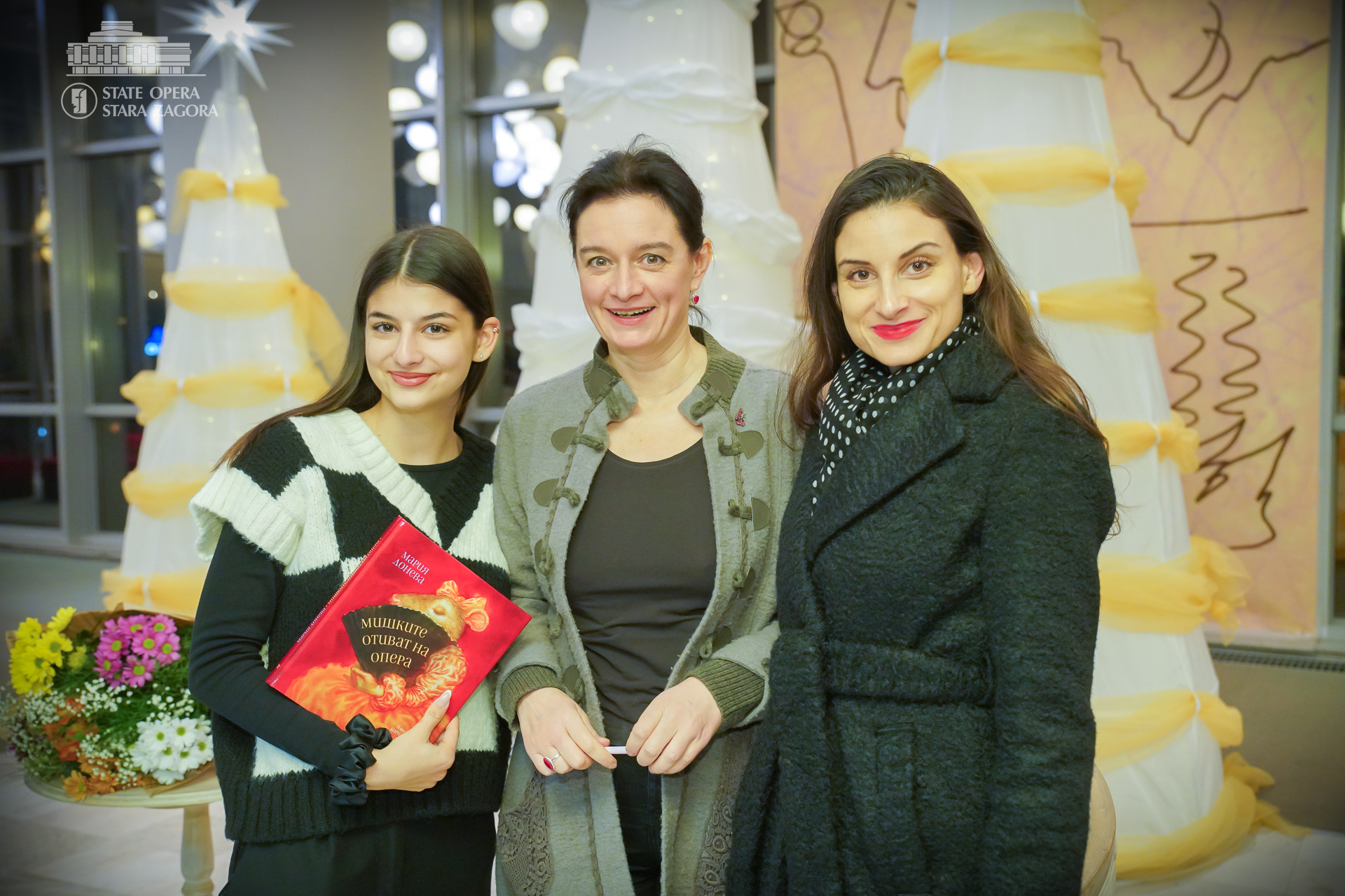 Представям си колко странно може да прозвучи това, но от един час разглеждам снимките от снощи, смея се и по едно време май и плаках. И не съм написала и една дума, само преживявам снощната премиера. А трябва да се разкаже. Първо, благодаря на Уляна Кьосева за това, че ме покани да представя „Мишките отиват на опера“ точно там, в самата опера. Особено е, защото точно това е конкретната опера, в която Миленка и Яничка ме заведоха и ми показаха колко хубаво нещо е операта изобщо. И като съм писала за хор, балет, музиканти, солисти и за лампичката „изход“, съм имала предвид точно тези изпълнители, по имена и лица, с техните гласове, тези светлини и всичко това. Поемата е израз за моята почит и моя възторг. От 18 часа във фоайето – премиера на книгата, от 19 часа – премиера на „Лешникотрошачката“ в изпълнение на Детската балетна школа към Държавна опера Стара Загора. И отивам. Ще се опитам съвсем сбито и кратко да ви кажа какво се случи там. Влязох през Служебния вход и видях познати лица от оперния хор, видях микроскопични балеринчета, развълнувани, че след малко ще имат спектакъл. Уляна ме поведе към фоайето и по пътя ни пресрещна Кармен!