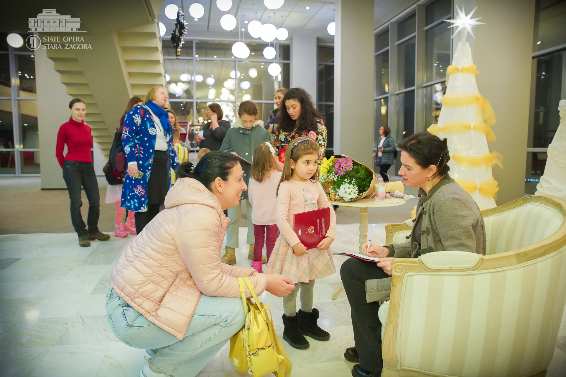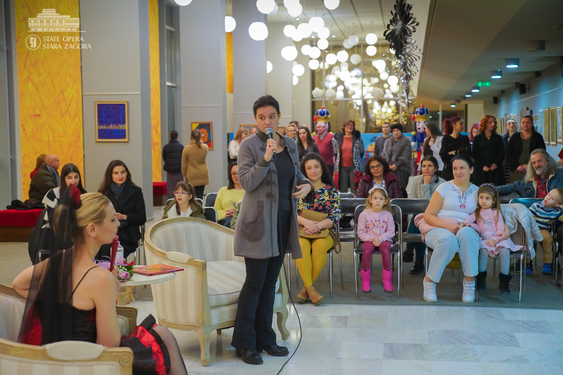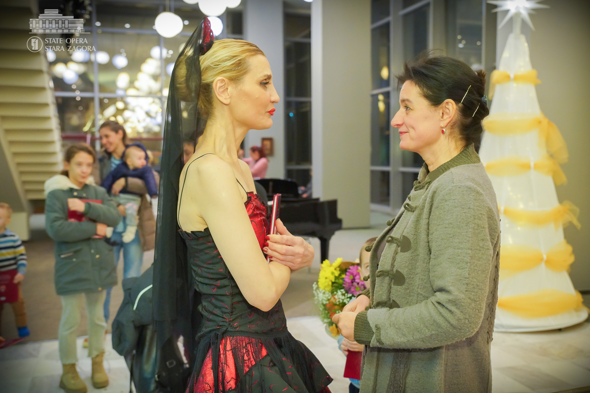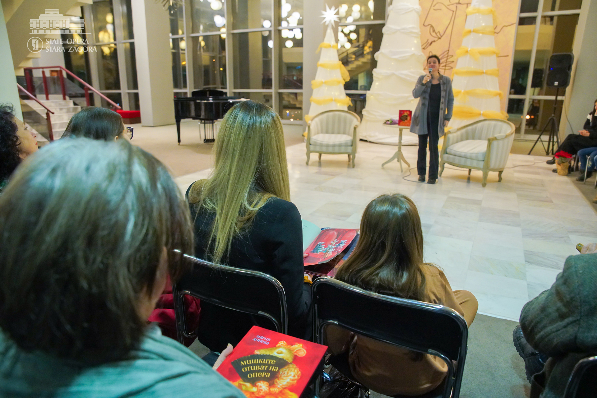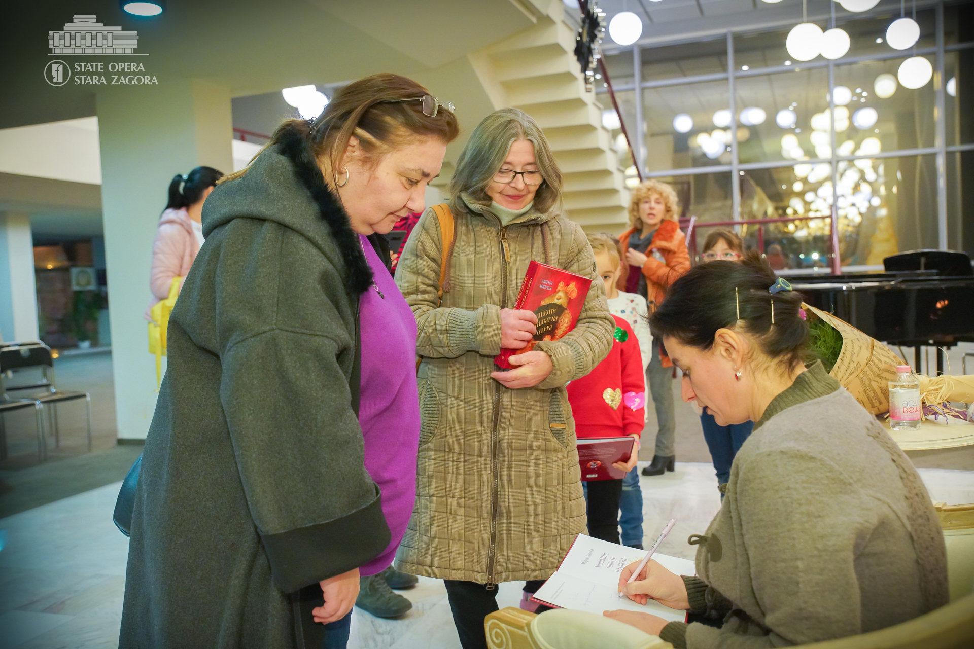 Представям си колко странно може да прозвучи това, но от един час разглеждам снимките от снощи, смея се и по едно време май и плаках. И не съм написала и една дума, само преживявам снощната премиера. А трябва да се разкаже. Първо, благодаря на Уляна Кьосева за това, че ме покани да представя „Мишките отиват на опера“ точно там, в самата опера. Особено е, защото точно това е конкретната опера, в която Миленка и Яничка ме заведоха и ми показаха колко хубаво нещо е операта изобщо. И като съм писала за хор, балет, музиканти, солисти и за лампичката „изход“, съм имала предвид точно тези изпълнители, по имена и лица, с техните гласове, тези светлини и всичко това. Поемата е израз за моята почит и моя възторг. От 18 часа във фоайето – премиера на книгата, от 19 часа – премиера на „Лешникотрошачката“ в изпълнение на Детската балетна школа към Държавна опера Стара Загора. И отивам. Ще се опитам съвсем сбито и кратко да ви кажа какво се случи там. Влязох през Служебния вход и видях познати лица от оперния хор, видях микроскопични балеринчета, развълнувани, че след малко ще имат спектакъл. Уляна ме поведе към фоайето и по пътя ни пресрещна Кармен!