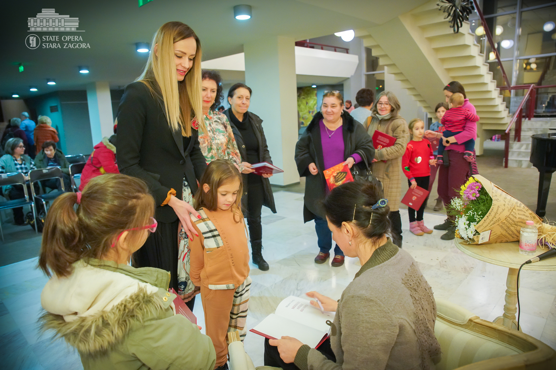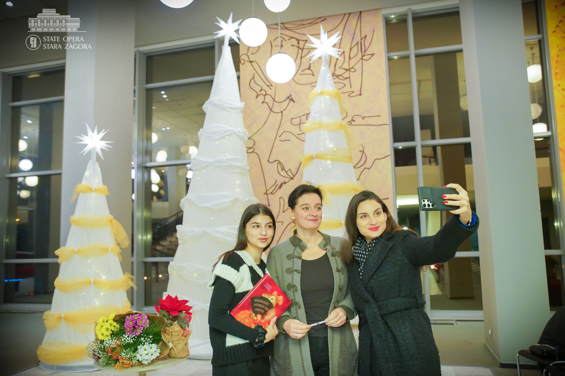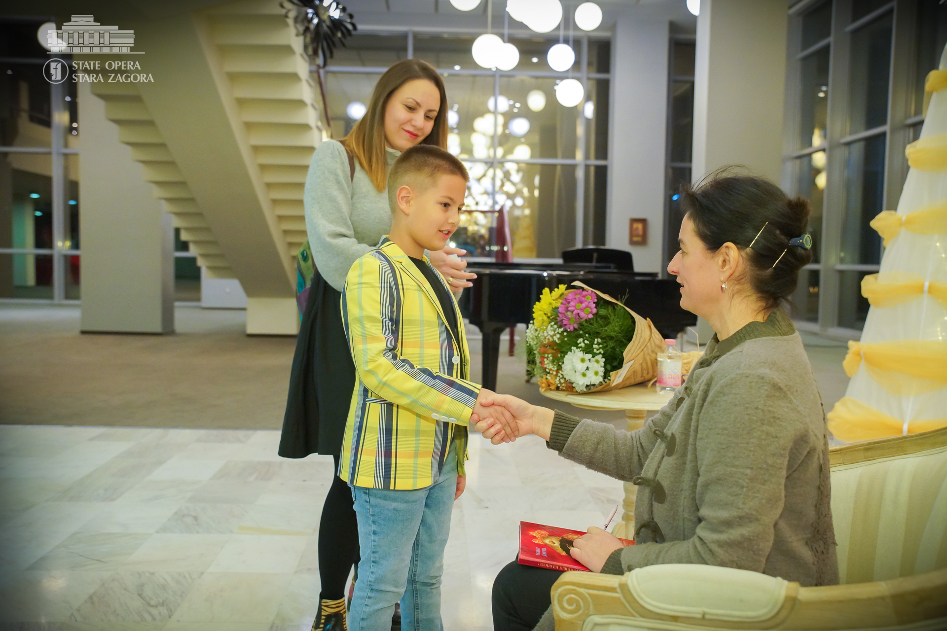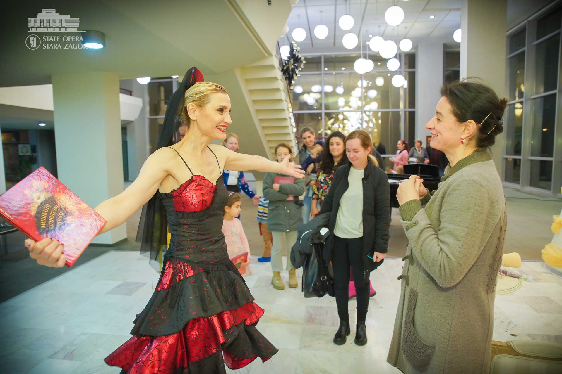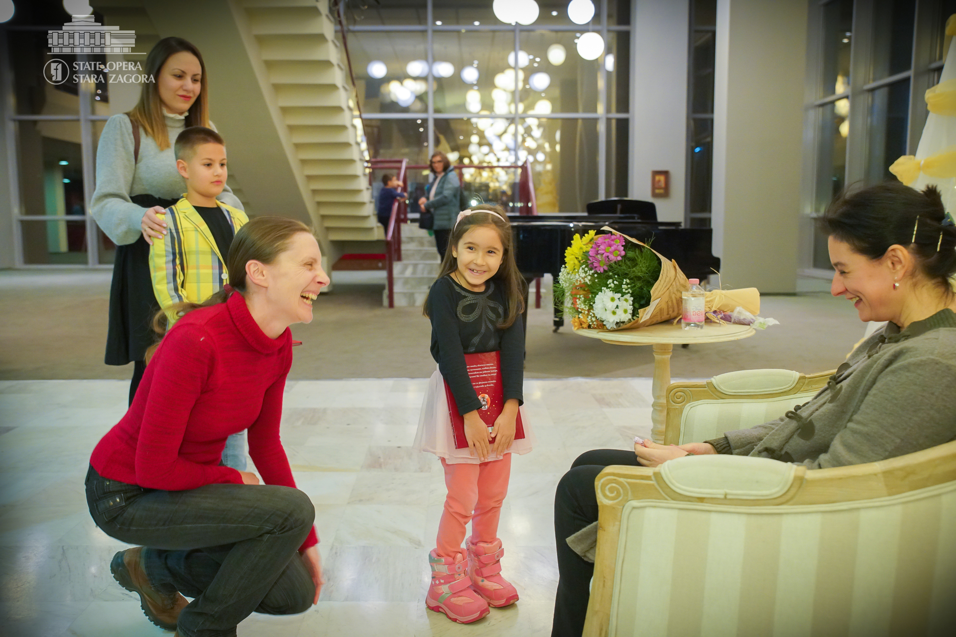Представям си колко странно може да прозвучи това, но от един час разглеждам снимките от снощи, смея се и по едно време май и плаках. И не съм написала и една дума, само преживявам снощната премиера. А трябва да се разкаже. Първо, благодаря на Уляна Кьосева за това, че ме покани да представя „Мишките отиват на опера“ точно там, в самата опера. Особено е, защото точно това е конкретната опера, в която Миленка и Яничка ме заведоха и ми показаха колко хубаво нещо е операта изобщо. И като съм писала за хор, балет, музиканти, солисти и за лампичката „изход“, съм имала предвид точно тези изпълнители, по имена и лица, с техните гласове, тези светлини и всичко това. Поемата е израз за моята почит и моя възторг. От 18 часа във фоайето – премиера на книгата, от 19 часа – премиера на „Лешникотрошачката“ в изпълнение на Детската балетна школа към Държавна опера Стара Загора. И отивам. Ще се опитам съвсем сбито и кратко да ви кажа какво се случи там. Влязох през Служебния вход и видях познати лица от оперния хор, видях микроскопични балеринчета, развълнувани, че след малко ще имат спектакъл. Уляна ме поведе към фоайето и по пътя ни пресрещна Кармен!