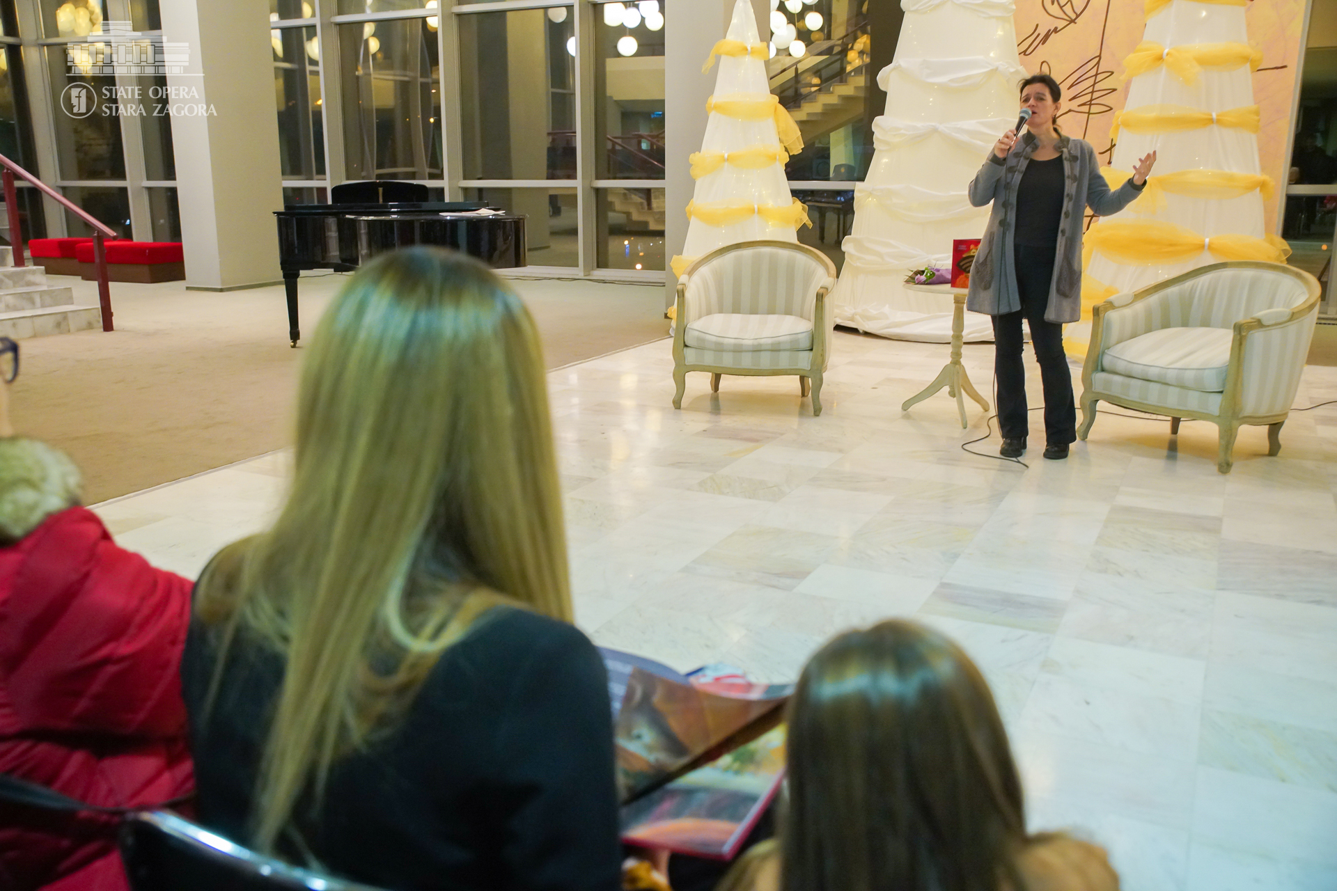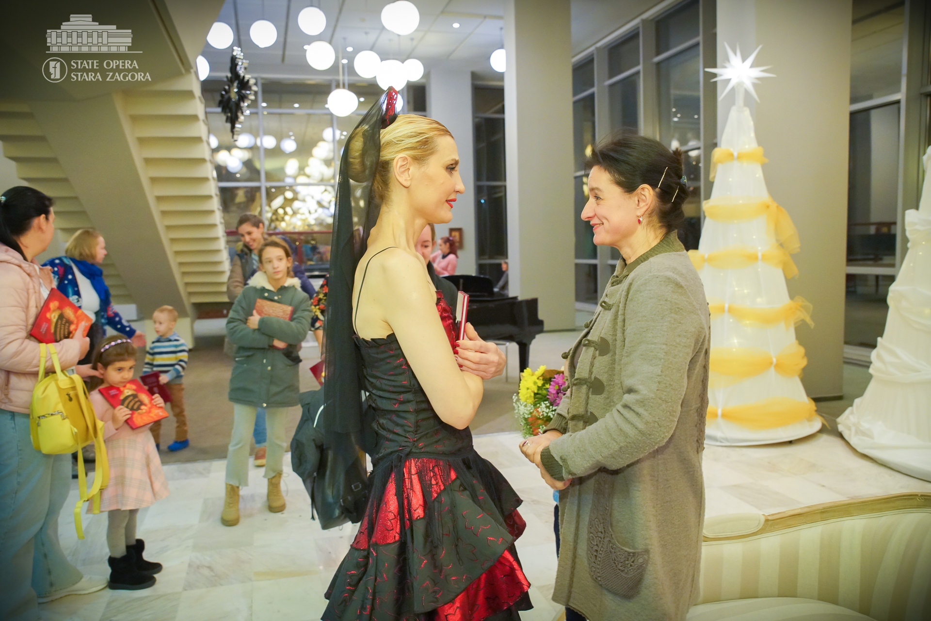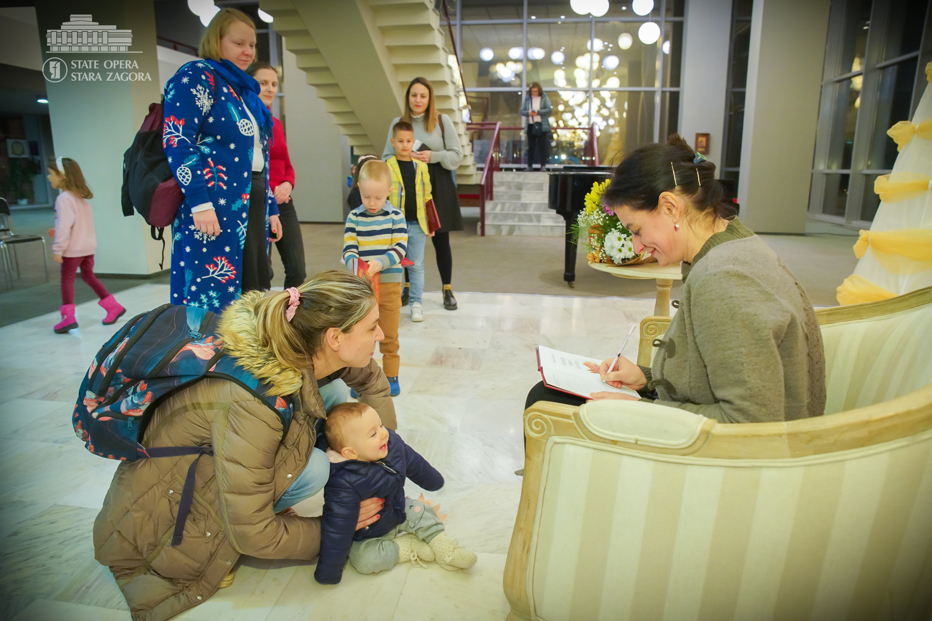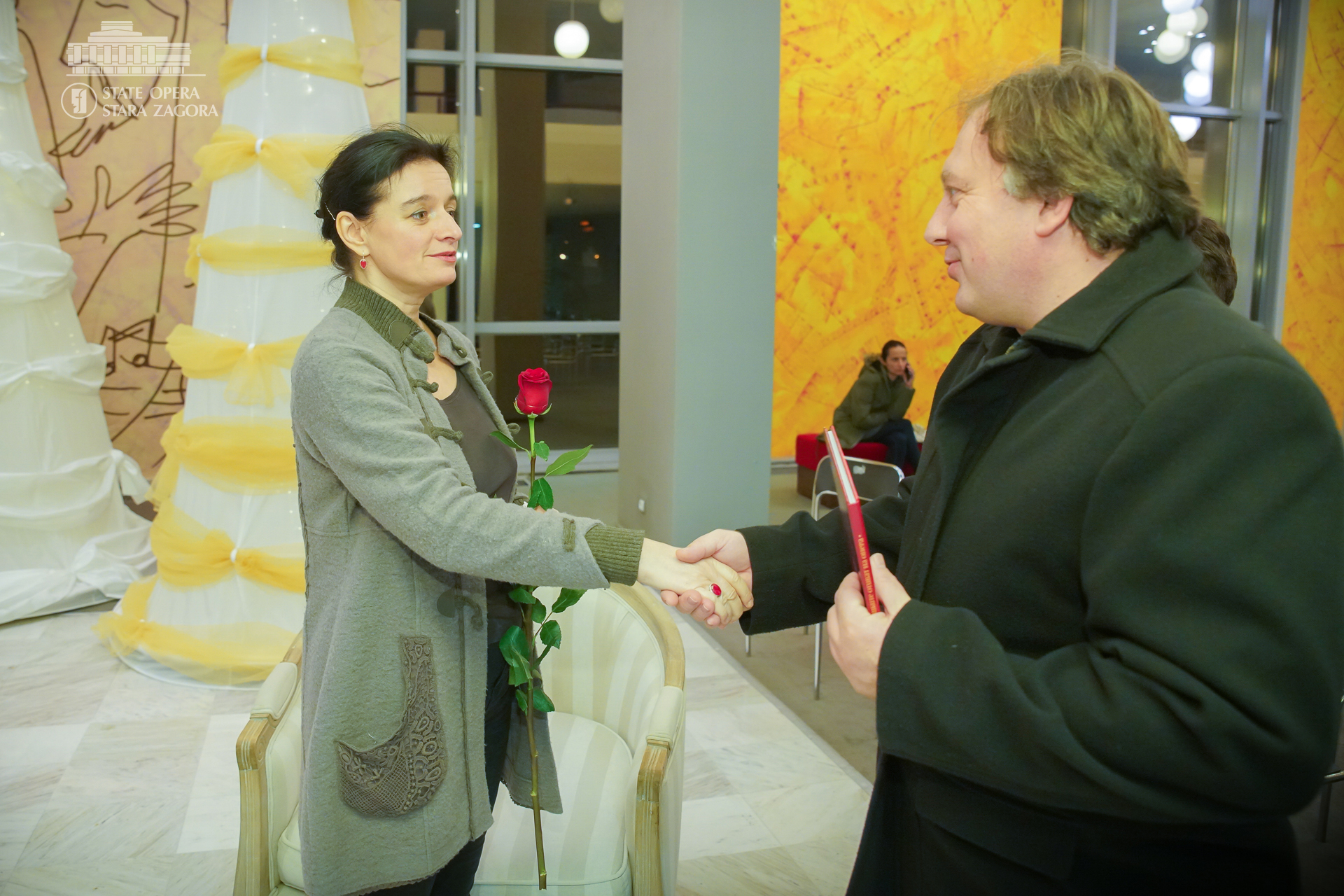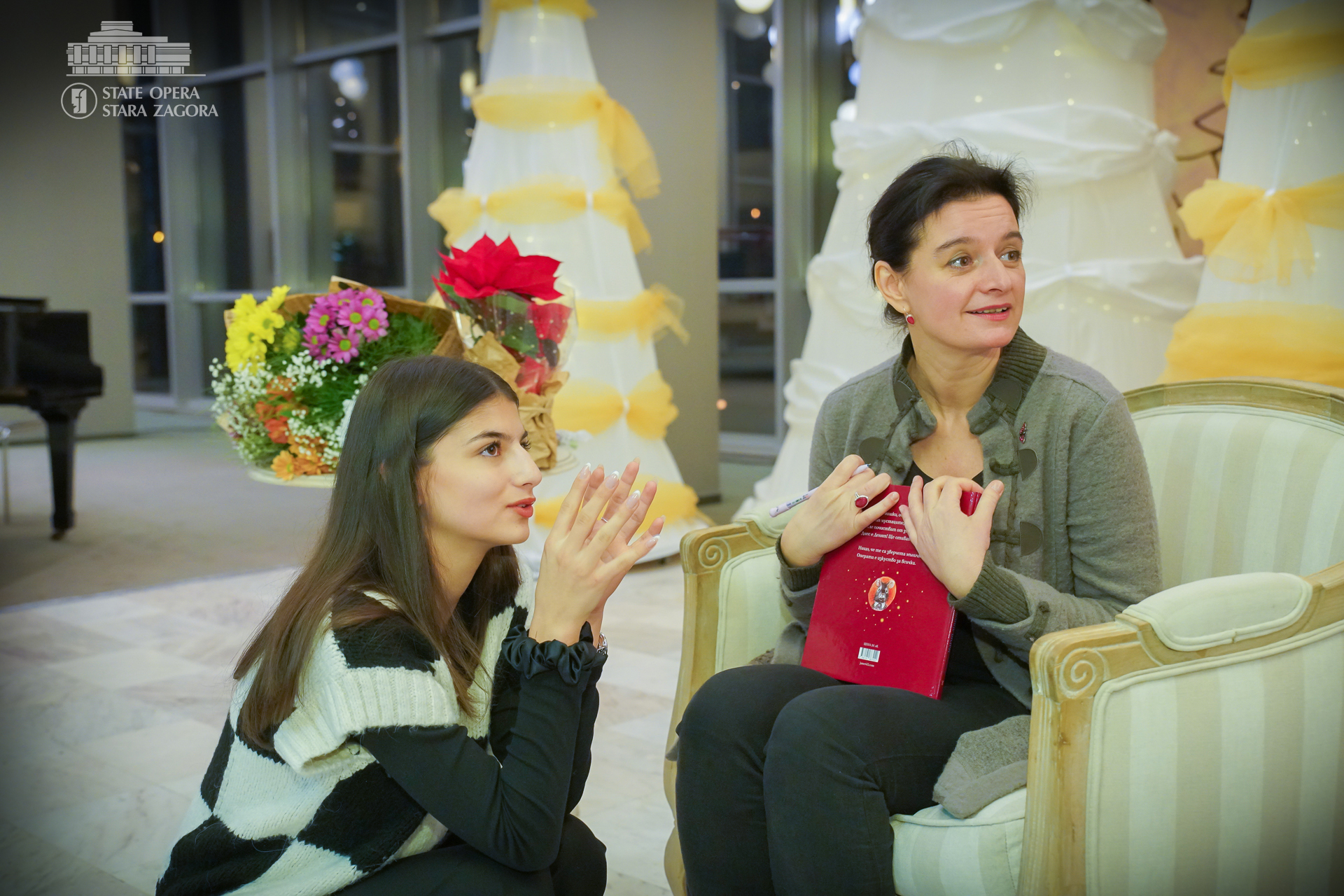 Представям си колко странно може да прозвучи това, но от един час разглеждам снимките от снощи, смея се и по едно време май и плаках. И не съм написала и една дума, само преживявам снощната премиера. А трябва да се разкаже. Първо, благодаря на Уляна Кьосева за това, че ме покани да представя „Мишките отиват на опера“ точно там, в самата опера. Особено е, защото точно това е конкретната опера, в която Миленка и Яничка ме заведоха и ми показаха колко хубаво нещо е операта изобщо. И като съм писала за хор, балет, музиканти, солисти и за лампичката „изход“, съм имала предвид точно тези изпълнители, по имена и лица, с техните гласове, тези светлини и всичко това. Поемата е израз за моята почит и моя възторг. От 18 часа във фоайето – премиера на книгата, от 19 часа – премиера на „Лешникотрошачката“ в изпълнение на Детската балетна школа към Държавна опера Стара Загора. И отивам. Ще се опитам съвсем сбито и кратко да ви кажа какво се случи там. Влязох през Служебния вход и видях познати лица от оперния хор, видях микроскопични балеринчета, развълнувани, че след малко ще имат спектакъл. Уляна ме поведе към фоайето и по пътя ни пресрещна Кармен!