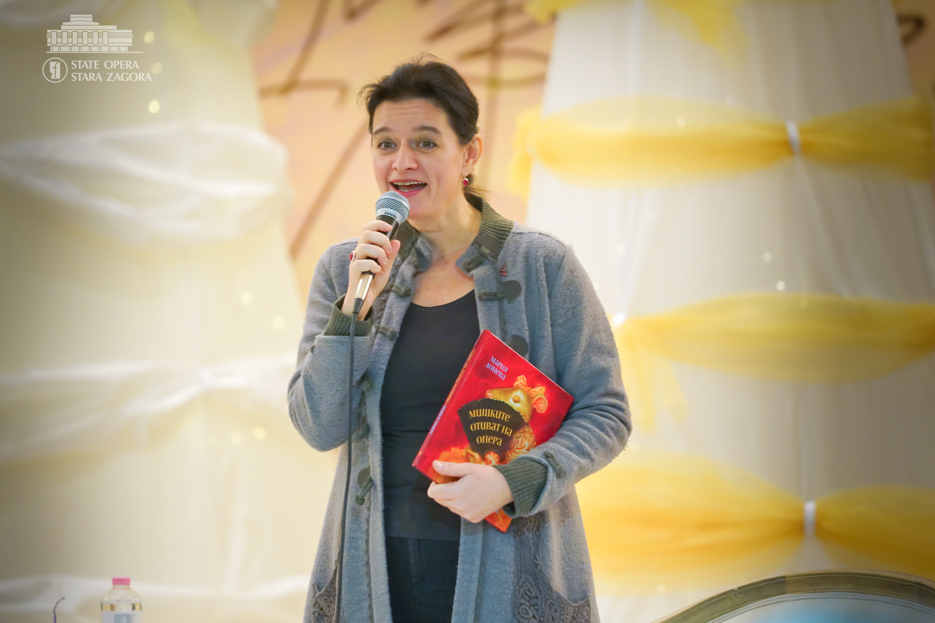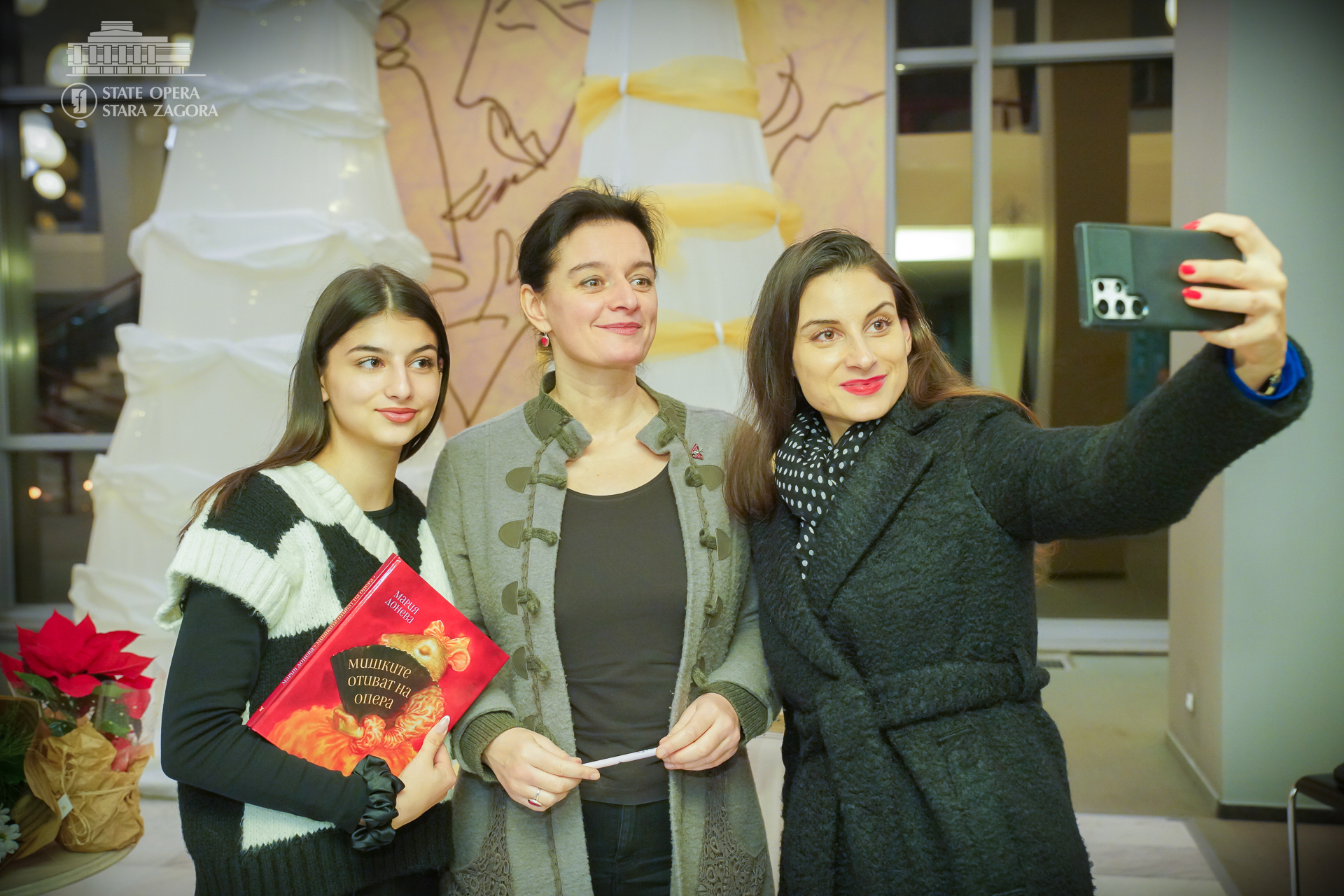 А когато стигнахме до края на Кармен, до самия край на приказката, и беше много тъжно, те изпяха и големия хор, онзи тържествения, за коридата. После казах поемата за мишките, когато си върнах дар словото, и подписвах книги, и си говорихме. Толкова беше легендарно, че не мога да повярвам, че се случи точно снощи и аз бях там. „Мишките отиват на опера“ е подходяща за онези, които никога не са стъпвали на опера, както и за тези, които са били там много пъти и я обичат от все сърце. Мишките, това е публиката, която отива, за да се докосне до най-красивото на света, да се вълнува и да преживее в мечтите си нещо изключително. Това, че оперните артисти пяха за нас снощи, беше съвсем естествено, уместно и подходящо – те това правят, това им е работата, но освен това беше изключителен жест. Аз наистина никога няма да забравя това. А имаме и снимки, благодарение на Рад Димитров. Тези мишки са родени с късмет, нали?