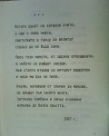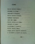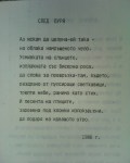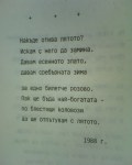 Но сега по същество. И аз съм участвала в асамблеята „Знаме на мира“ през 84-а година (и ти тогава, нали?) точно като талантливо дете, пишещо стихове. 🙂 Това си остават и до днес едни от най-хубавите дни от детството ми. Имам една книжка оттогава със стихотворенията на всичките участници, написани собственоръчно от нас на едни листове хартия, които ни раздадоха. Ако и ти я имаш аз съм адашката ти от Перник :). И сега като прочетох тази твоя книжка всъщност ми е много познат стилът ти. Да не би да сме се засекли някога и на Славейковите дни вТрявна?