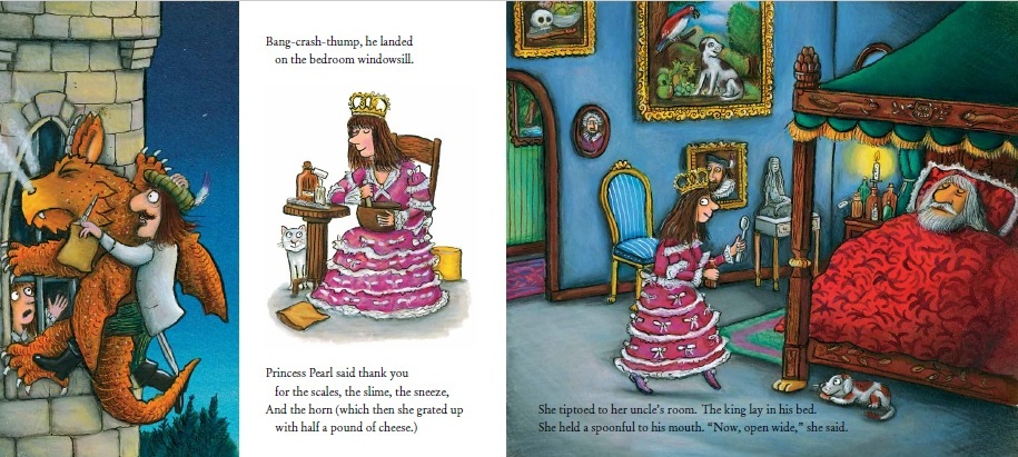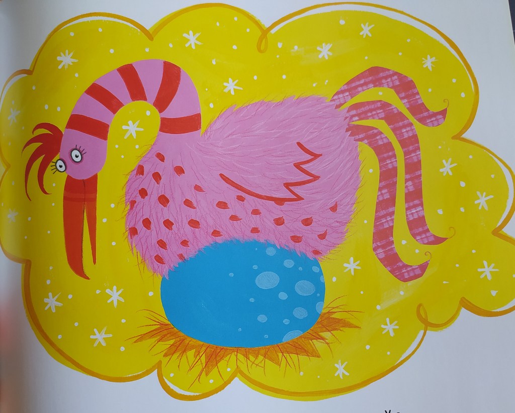 Обичам тази книга, защото в нея има една розовопера гушка, която снася гигантски яйца и мърка като котка и това ми е много смешно.