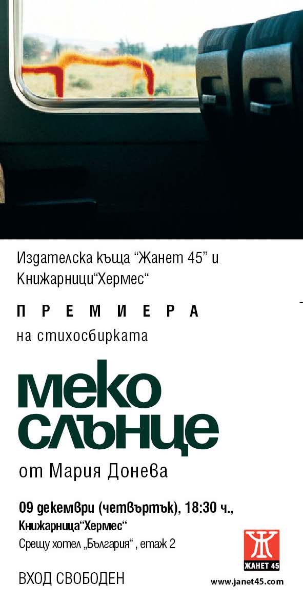 1. Другата седмица в понеделник, на 22.11, ще отида в Пловдив за изписването на „Меко слънце” от родилния дом за книги, известен като Издателска къща Жанет 45.