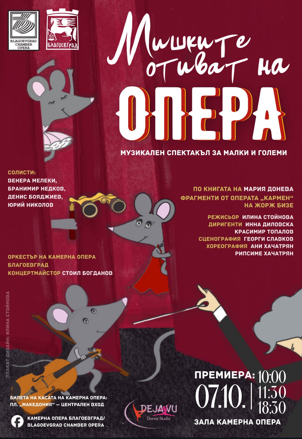 Камерна опера Благоевград ще даде старт на творческия сезон 2025/2026 със световната премиера на музикалния спектакъл „Мишките отиват на опера“ по едноименната книга на Мария Донева. Постановката, създадена по музика от операта „Кармен“ на Жорж Бизе, ще бъде представена за първи път именно в Благоевград.