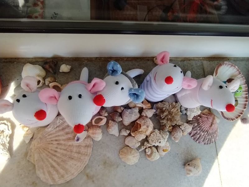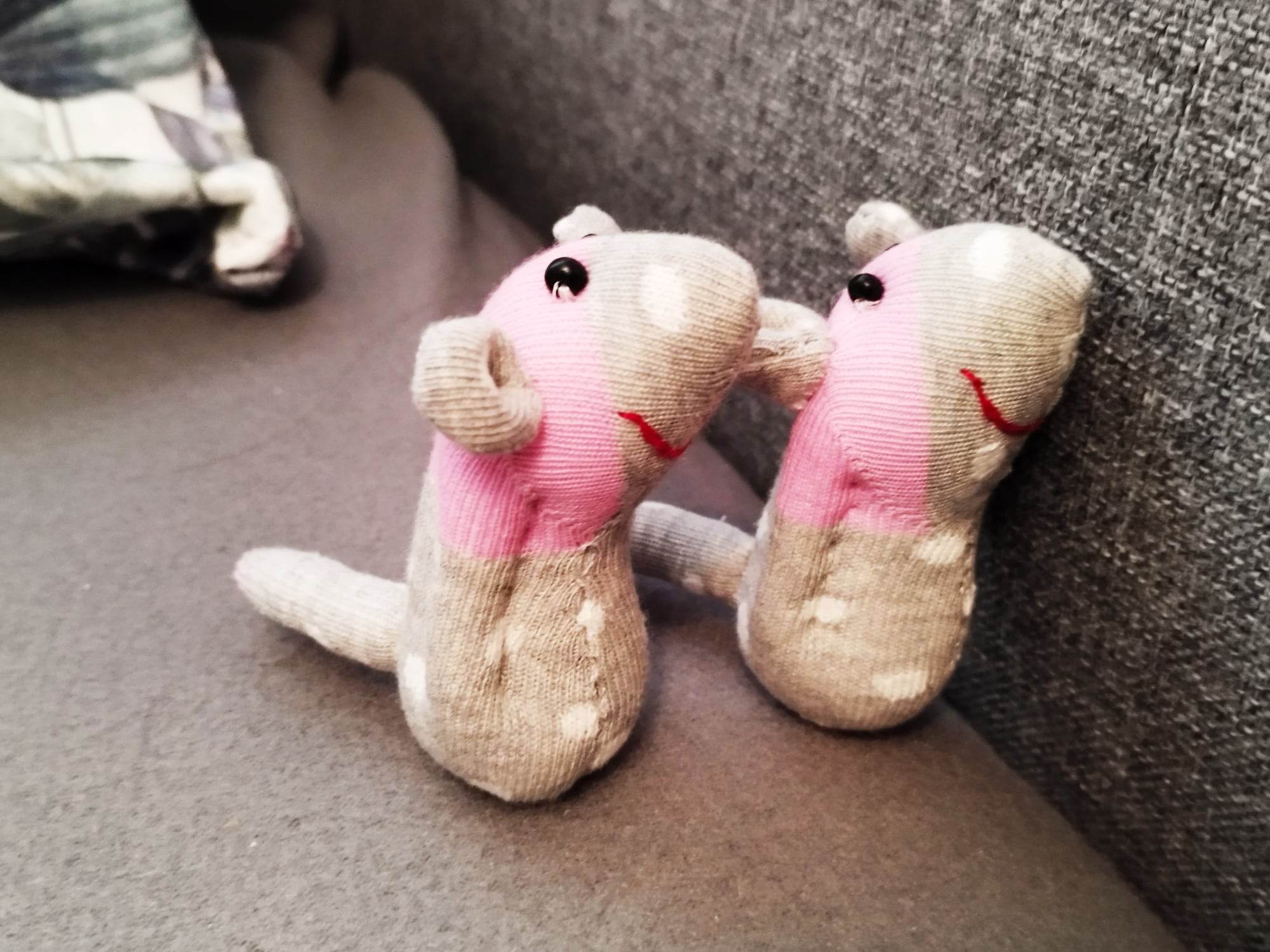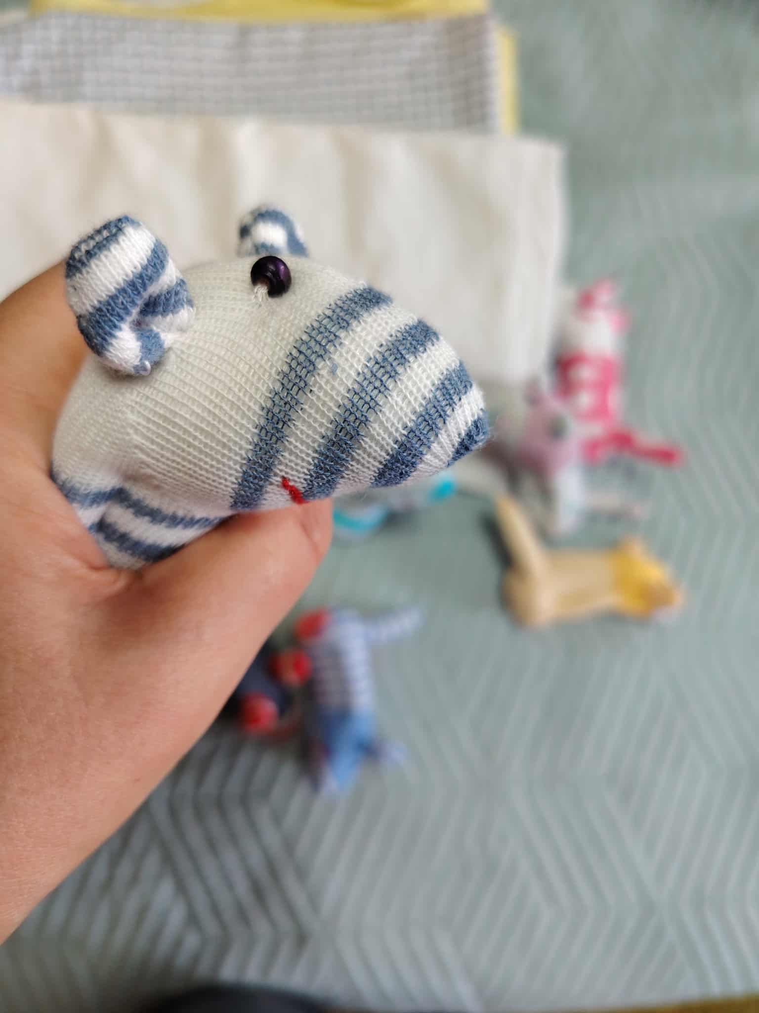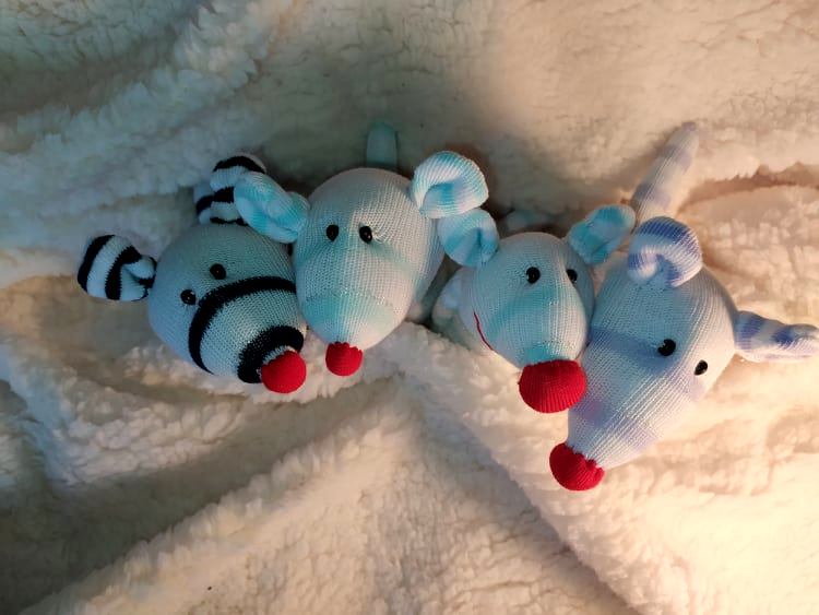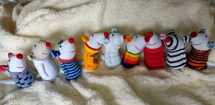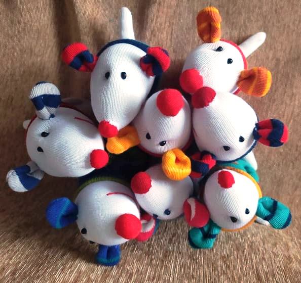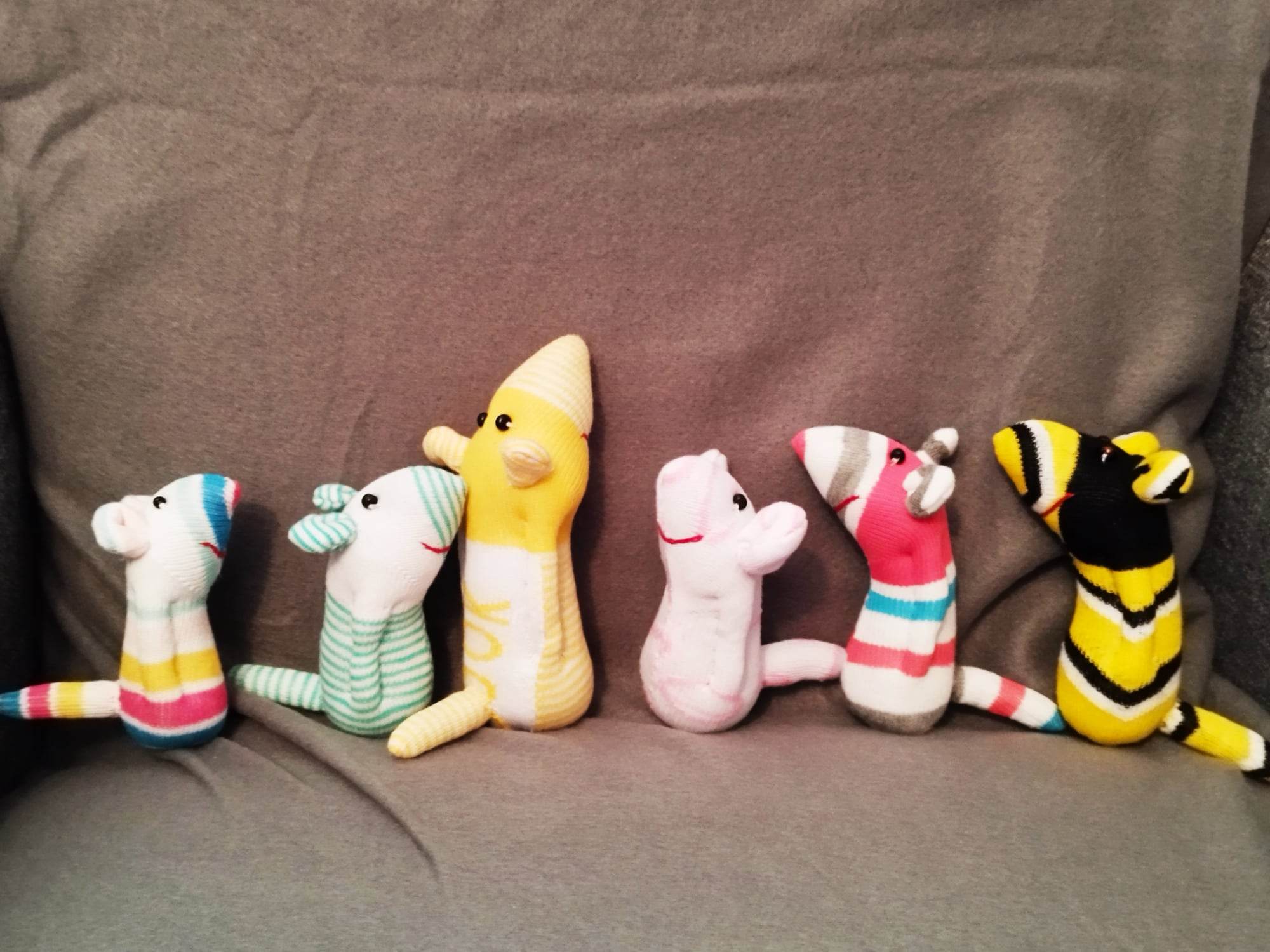 Шия само от време на време, обаче играчките се задомяват по-бързо, отколкото смогвам да ги снимам, и повечето хич не стигат до тук. Вчера и днес правих мишки (вж. по-долу).