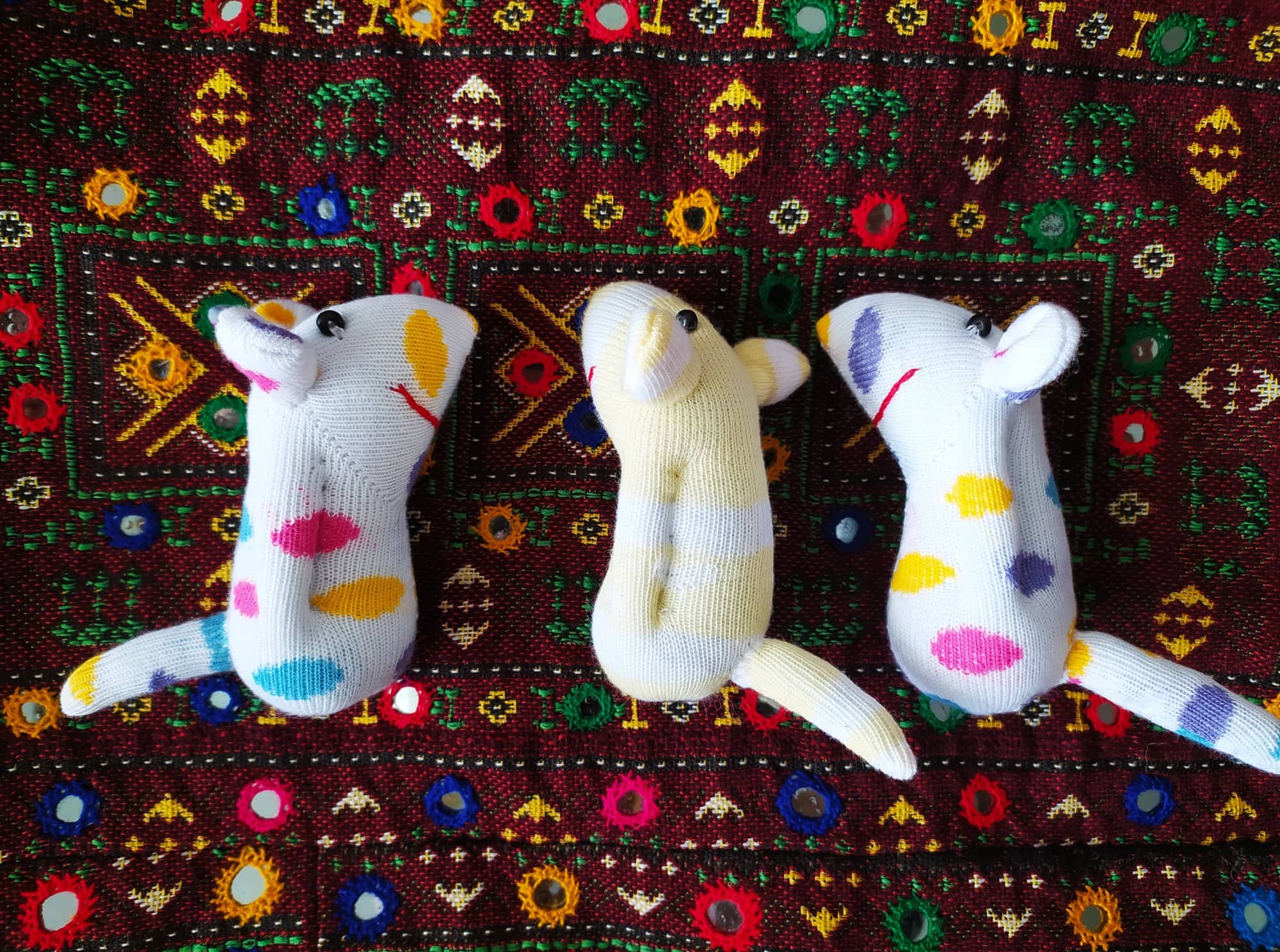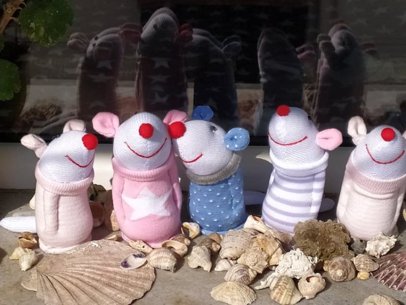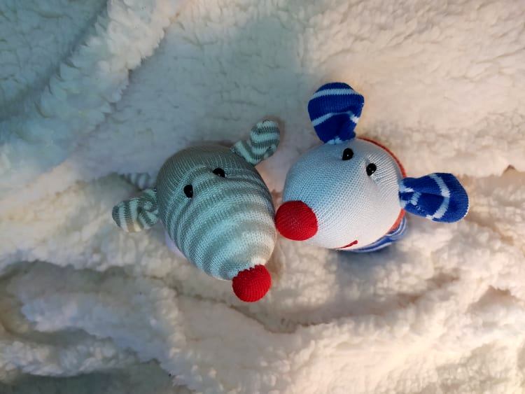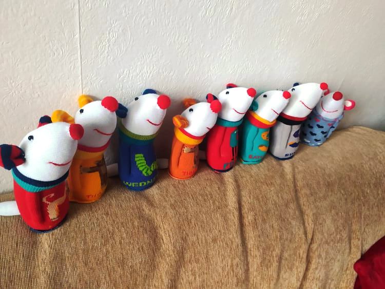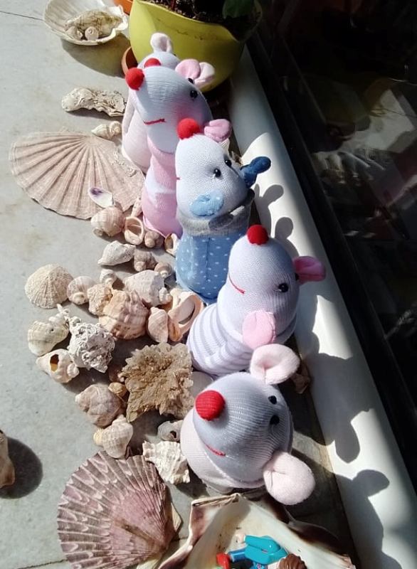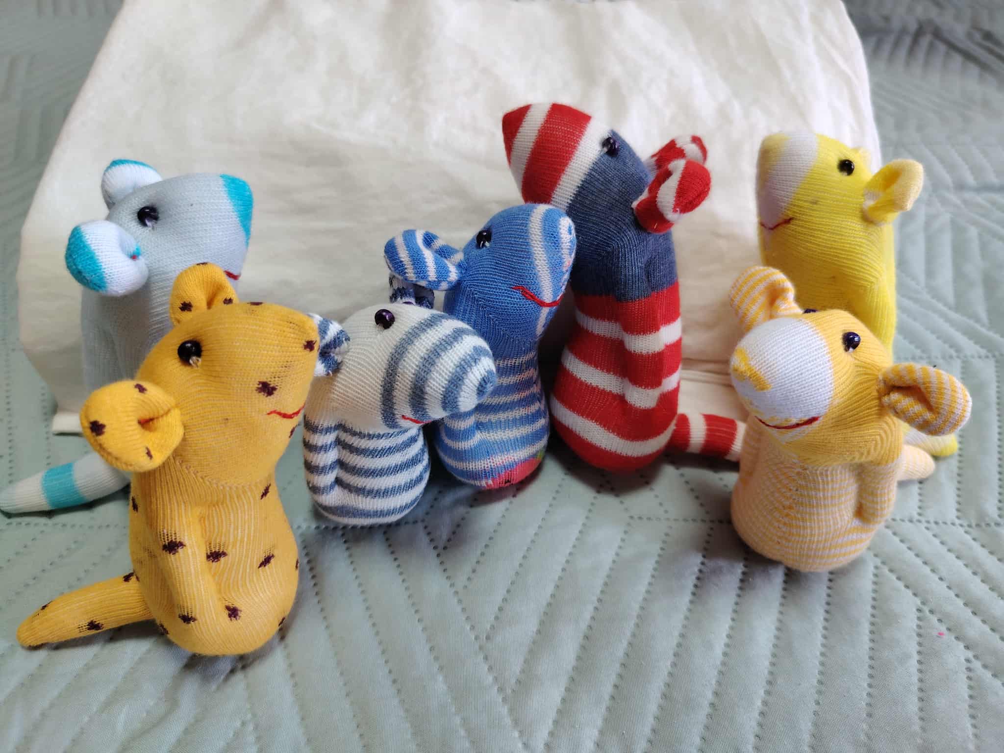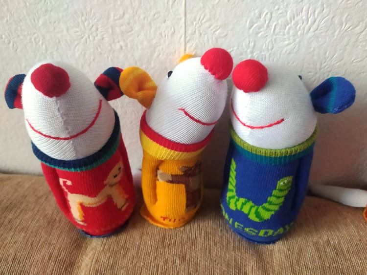 Шия само от време на време, обаче играчките се задомяват по-бързо, отколкото смогвам да ги снимам, и повечето хич не стигат до тук. Вчера и днес правих мишки (вж. по-долу).